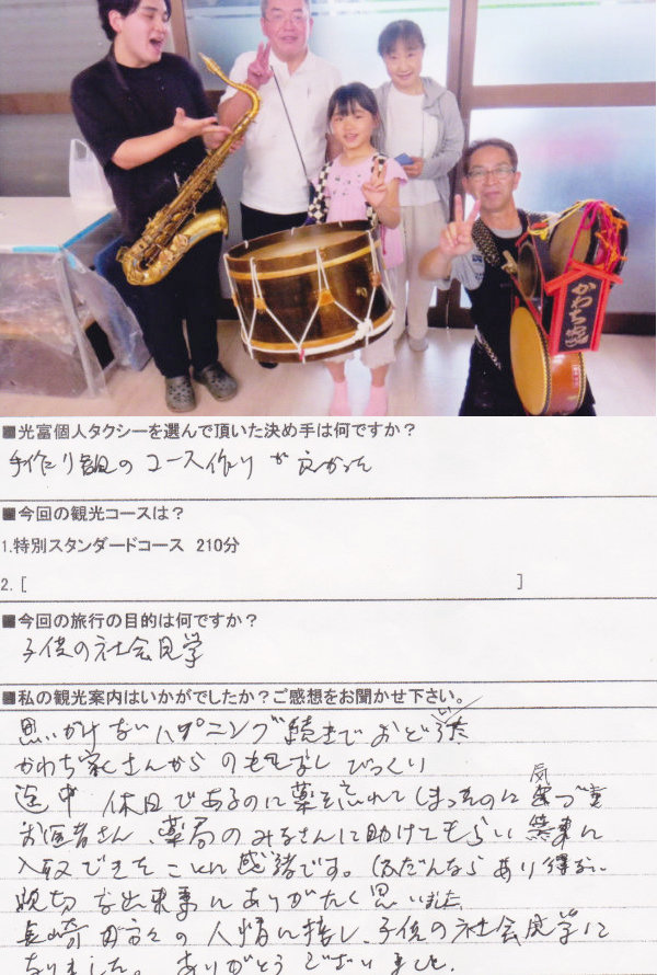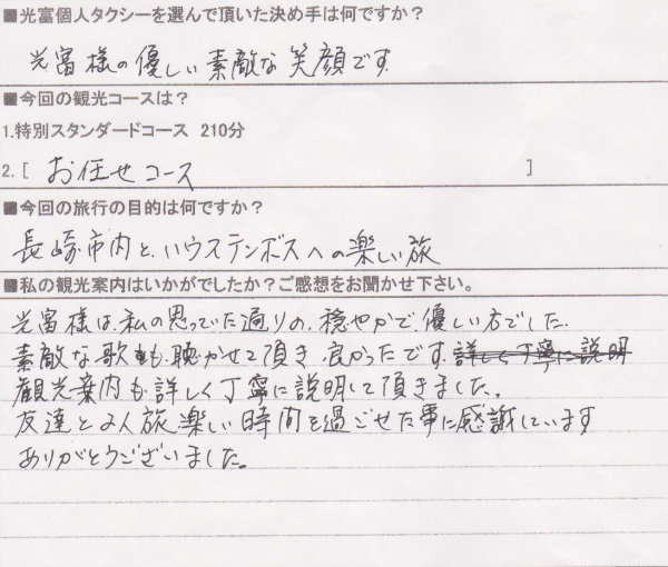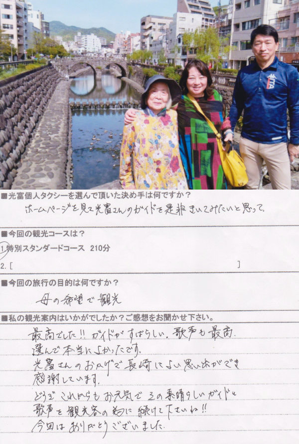 この度は光富個人タクシーをご利用いただき、また温かいご感想をありがとうございました。楽しく、安心して、観光していただけたとのお言葉、大変励みになります。お客様との出会いに心より感謝しております。次回もぜひ長崎の魅力をご案内させてください!(光富)