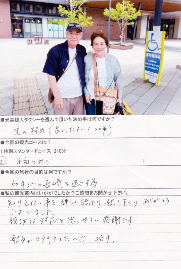 長崎の浦上地区では、同じ人間として生まれながら生きた時代が違うだけで大勢の人が殉教し、その後原子爆弾により再び大勢の人が亡くなりました。その中には、多くの子供達、女性、そして年配の方々がいたのです。今の平和は間違いなく、この亡くなられた方々の犠牲の上にあります。今、ここに来られる人達は亡くなられた方々のため、そして将来の平和の維持の為に平和の祈りを捧げられる事と思います。その心の優しさが有る限り、二度と悲惨な出来事は繰り返されないと思います。