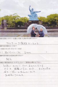 お客様は車椅子をご利用とのことで、少しでも快適に、そして安心して観光を楽しんでいただけるよう、道中ずっと心を配らせていただきました。観光中、私の説明に熱心に耳を傾けてくださり、会話もとても弾んで、まるで旧知の友人と旅をしているような、あたたかな時間を過ごすことができました。とくに嬉しかったのは、私の歌を気に入ってくださり、「素敵な歌を聴けました」と言っていただけたことです。その言葉に、私の心まで温まりました。初めての長崎旅行だったそうですが、「光富さんのおかげで、いろんなことが分かりました!」とおっしゃっていただき、少しでもこの町の魅力をお伝えできたこと、本当に光栄に思います。そして、思いがけず嬉しかったのが、お客様と私が同い年だったこと。旅の途中でそんな共通点に気づき、一気に距離が縮まったように感じました。